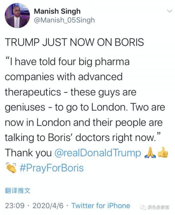 另外,在得知鲍里斯转入ICU后,美国总统特朗普也表达了关心,表示已经要求4家顶级制药公司派出专家前往伦敦,其中2名专家现在就在伦敦,将立刻和鲍里斯的医生对话并给予帮助。