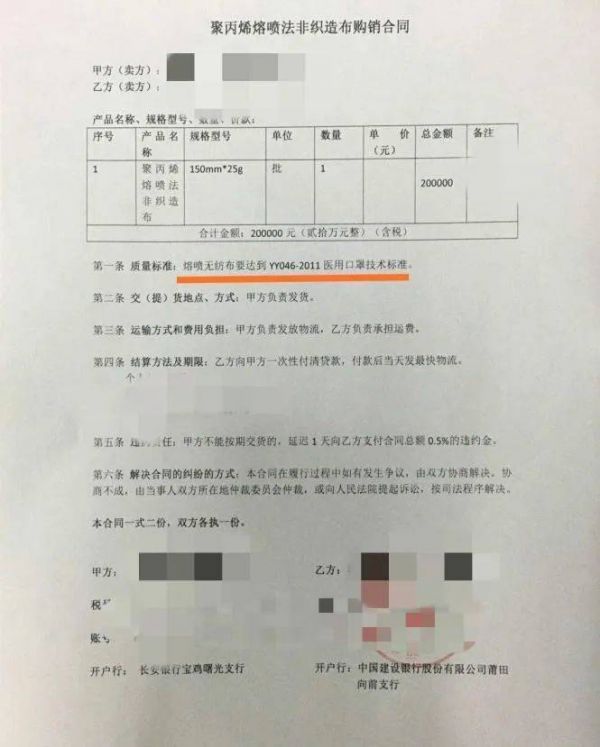 我们对接的出口客户主要来自欧洲国家,包括意大利等国,它们订制的口罩以医用为主,所以对原材料要求比较高,采购合同上最主要的一条质量标准是“熔喷无纺布要达到YY046—2011医用口罩技术标准”,也就是至少克重50g。