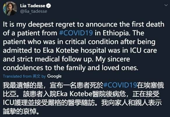 当地时间4月5日20时44分,埃塞俄比亚卫生部长Lia Tadesse宣布,埃塞俄比亚出现了首个死亡病例。