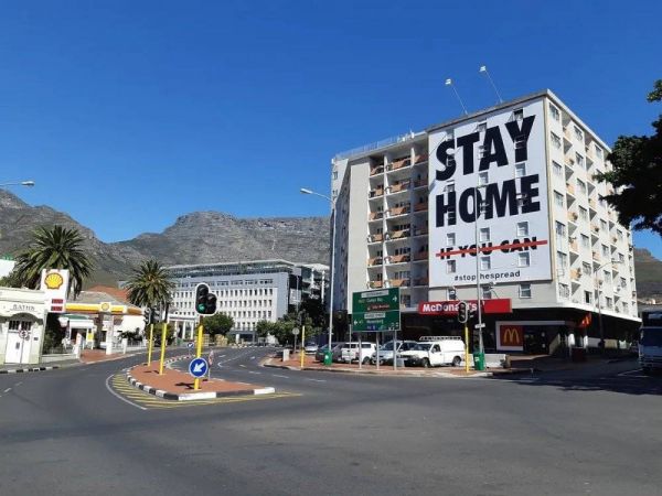 开普敦长街尽头,一块广告牌上写着“待在家里,停止传播”。/wiki