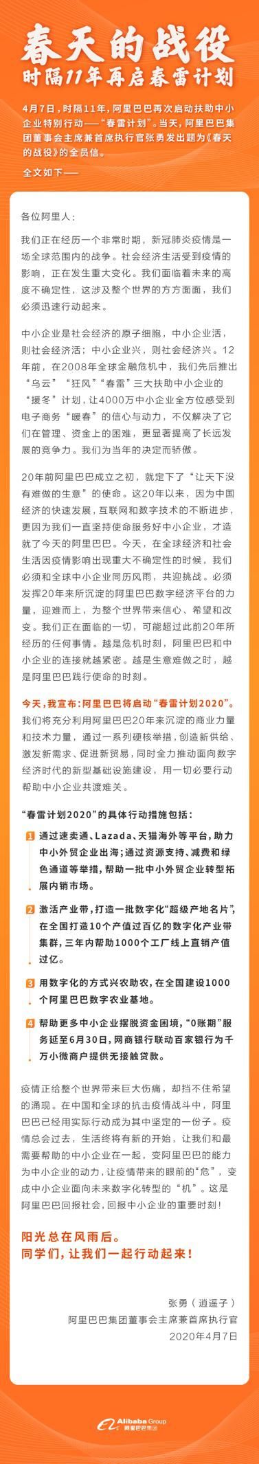 重启“春雷计划”这一天,阿里巴巴集团董事会主席兼首席执行官张勇发出一封题为《春天的战役》的全员信,信中说:“我们将充分利用阿里巴巴20年来沉淀的商业力量和技术力量,通过一系列硬核举措,创造新供给、激发新需求、促进新贸易,同时全力推动面向数字经济时代的新型基础设施建设,用一切必要行动帮助中小企业共渡难关。”