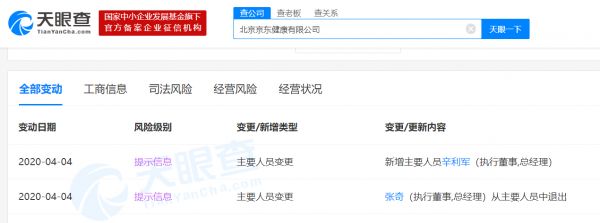 网易科技讯 4月7日消息,天眼查数据显示,4月4日,京东健康的运营主体——北京京东健康有限公司发生工商变更,京东一号员工张奇退出法定代表人、执行董事、总经理之列,均由公司CEO辛利军接任。