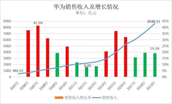 先看销售收入。2019年华为实现销售收入8588.33亿元,同比增长19.1%,这个增速在华为公司历史上处于什么样的位置?请看下图: