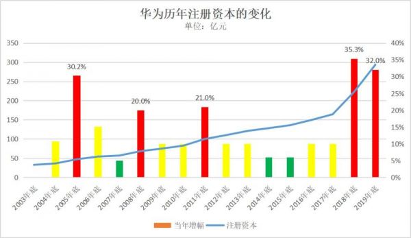不过,最近两年的增幅可不一般。老冀吃惊地发现,2018年华为做了一次增资,将注册资本增加了35.3%;2019年又做了一次增资,注册资本又增加了32%;这也是自2004年以来增幅最大的两年。要知道,2017年年底华为的注册资本已经高达164.35亿元,在如此大的基数上还有如此高的增幅,说明华为确实在配股方面下了血本。