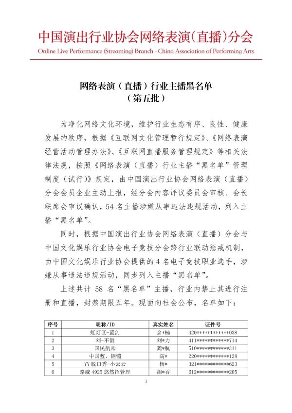 中新网客户端4月7日电(宋宇晟)中国演出行业协会网络表演(直播)分会4月7日向社会公布第五批主播黑名单,共58名。其中,54名主播涉嫌从事违法违规活动,4名电子竞技职业选手涉嫌从事违法违规活动。被列入黑名单的主播将在行业内禁止注册和直播,封禁期限5年。
