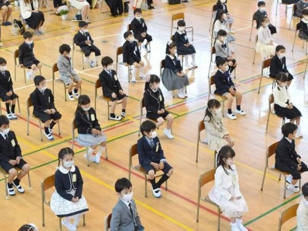 △ 在横滨一所学校的入学典礼上,学生之间保持一定的距离,并都戴上了口罩。图片来源 | 法新社