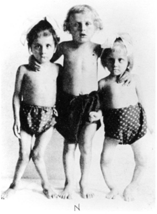 图中中间的孩子是正常小孩,左右的孩子患有佝偻病