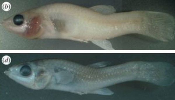 脊柱弯曲的斑马鱼,上图是从洞穴里抓获的(洞穴也是黑暗环境),下图则是在黑暗条件培养的