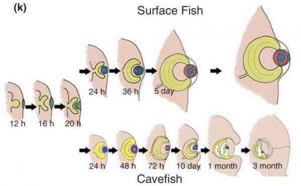 他们发现,和正常的鱼差不多,洞穴鱼最开始也是有眼睛的结构的,而逐渐长大的过程中眼睛的各个组件,比如晶状体、视网膜都没长起来。
