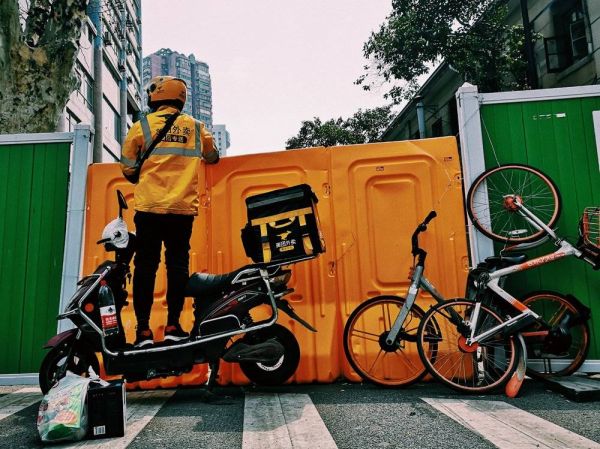 武汉外卖员在黄色围栏外站在电动车上等居民取外卖,受访者提供