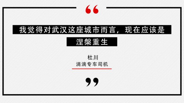 我觉得对武汉这座城市而言,现在应该是涅槃重生。可能外面的人不知道武汉人在家里面这70多天怎么过的,我作为一个保障司机,我可以看得到他们眼神中的恐惧和渴望。有时候我们去给居民送菜、送药,从他们看到我们的眼神中,看到那种在家里关七十几天对外出的渴望,特别不好受。最早的时候,我们送萝卜、莴笋这些青菜到社区,每家每户去发,居民隔离在家里,看到我们穿着防护服发菜很感激,但是也不敢靠近我们。