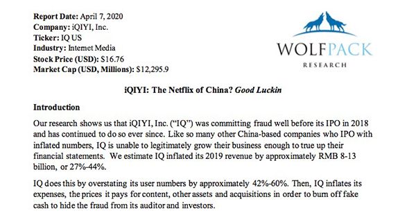4月7日晚间,爱奇艺遭Wolfpack Research做空。Wolfpack Research在其网站发布的报告显示,爱奇艺早在IPO之前便存在欺诈行为,且涉嫌财务造假。做空机构浑水称,它帮助了Wolfpack Research调查爱奇艺。