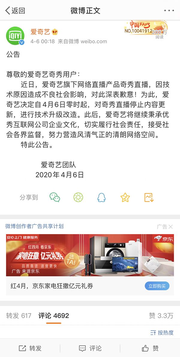 4月6日凌晨,爱奇艺官方微博发布公告称,旗下网络直播产品奇秀直播,因技术原因造成不良社会影响,为此自4月6日零时起,对奇秀直播停止内容更新,进行技术升级改造。