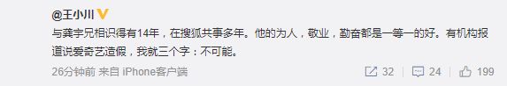 王小川表示,与龚宇兄相识得有14年,在搜狐共事多年。他的为人,敬业,勤奋都是一等一的好。有机构报道说爱奇艺造假,我就三个字:不可能。
