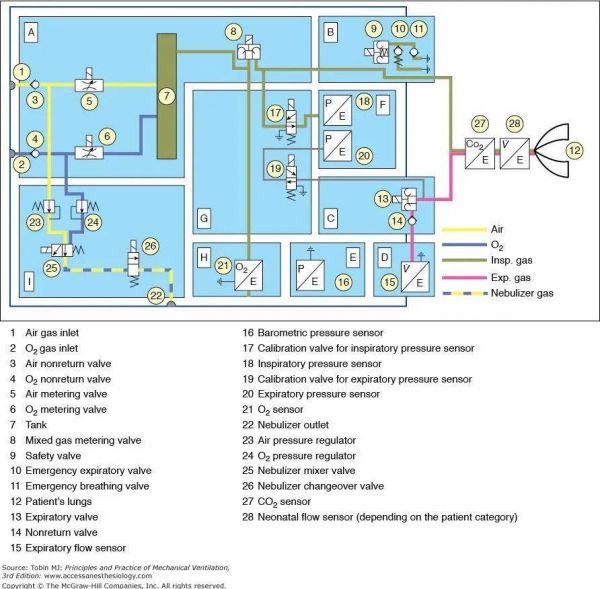 这是一个正压通气呼吸机的原理图(图源:accessmedicine)