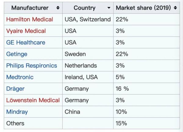 全球主要ICU呼吸机生产厂商(图源:wiki)
