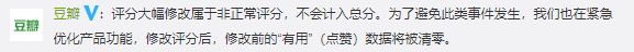 对此,豆瓣在微博中表示,评分大幅修改属于非正常评分,不会计入总分。为了避免此类事件发生,豆瓣也在紧急优化产品功能,修改评分后,修改前的“有用”(点赞)数据将被清零。