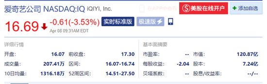 新浪科技讯 4月8日晚间消息,爱奇艺开盘跌3.53%,报16.69美元。