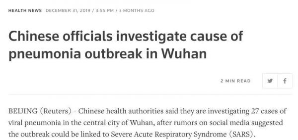 2019年12月30日,路透社援引中国政府的报道,武汉出现症状类似SARS的27个病例。