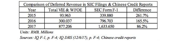 Wolfpack称,将一份中国披露的征信报告与爱奇艺招股书中数据对比发现,爱奇艺披露的2015、2016、2017年递延收入分别是该报告合计收入的3.6倍、2.7倍和1.9倍。此外,爱奇艺还存在订阅会员收入与递延收入不匹配的情况。在2008年第三季度至2009年第一季度,爱奇艺的报告称,付费用户增加了1610万,平均订阅期从6个月增加到8个月。然而,这一时期爱奇艺的递延收入同期下降了17%。