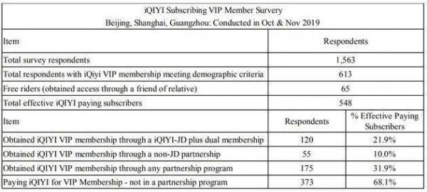 这里需要注意的是,Wolfpack Research选取的调查样本为北京、上海和广州三地的1563人,根据爱奇艺2019年第四季度财报,其会员总数为1.07亿,对比之下,样本是否具有说服力?有曾从事审计工作的人士向新浪科技表示,只调查一线城市的一千余人,样本不是很全面。“肯定是要针对各个城市类型、不同人群来做抽样的。”