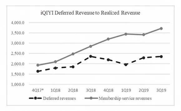 递延收入同时也是视频平台会员收入确认方式的特色,以爱奇艺为例,当用户购买会员时,充值记录为递延收入,在会员生效期间将按服务提供比例确认收入。也就是说,今天你花198元购买了爱奇艺一年的会员,这笔钱无法立即确认为收入,而是在达到收入确认条件后确认,并进入递延收入部分。