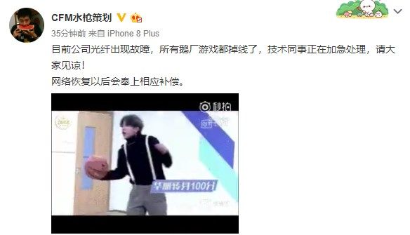 [下午3:45:20] 腾讯CF手游策划@CFM水枪策划 在微博上表示,腾讯公司光纤出现问题,与游戏相关的服务全部掉线,目前正在加紧处理。
