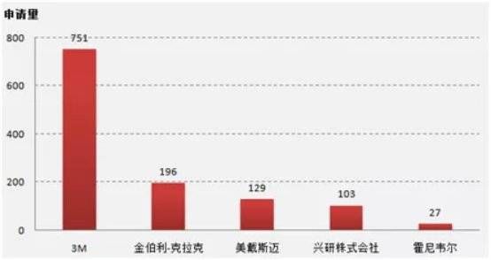 通过对中国专利文摘数据库(CNABS)以及德温特世界专利索引数据库(DWPI)对呼吸防护口罩进行专利检索发现,截至 2020 年 1 月,全球范围内该领域专利申请量排名前五位的申请人分别是 3M 公司(US)、金佰利公司 (US)、美戴斯迈公司 (US)、兴研株式会社 (JP)、霍尼韦尔国际公司 (US)。