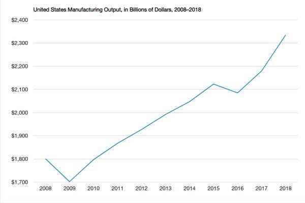 2019 年美国制造业产出概况,2009 年以来有一个非常明显的提升。数据来自 NAM(美国制造业协会)网站。