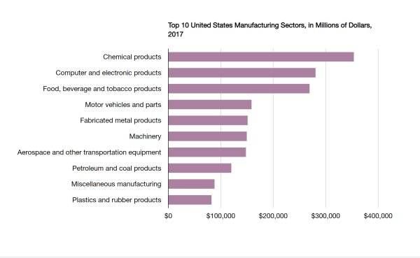 2019 年美国制造业概况,主要贡献来自诸如化学、电子、汽车等制造门类。数据来自 NAM