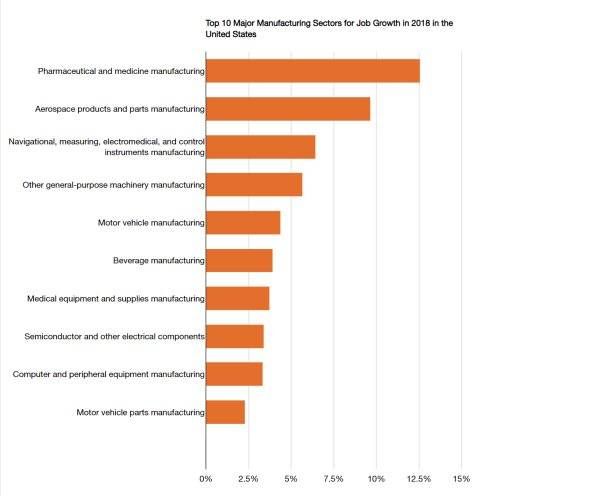 2019 年美国制造业概况,就业岗位增速最快的是制药。数据来自 NAM