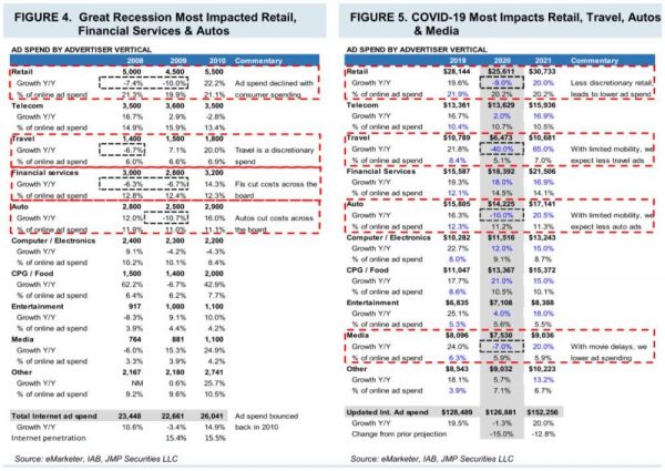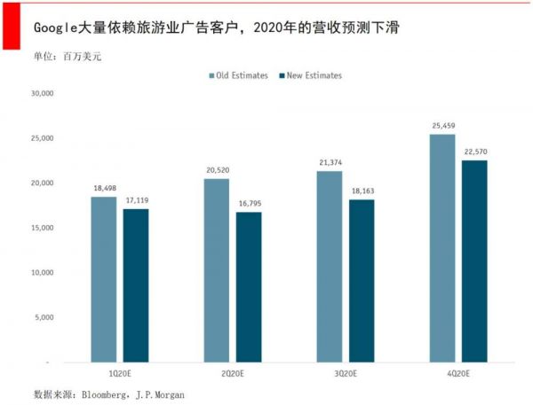 对于Google来说,虽然搜索仍然是广告商的必买项目,但Google的收入严重依赖旅游和零售领域(旅游占其广告收入的10%~15%),所以受影响比Facebook更大,例如J.P.Morgan大幅下调了对Google的预测。
