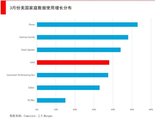 这次疫情带来的增长是前所未有的,从增长更平稳的电视消费量可以看出来。按尼尔森统计,最近美国电视消费量增长了60%,而这可能不是最高点。
