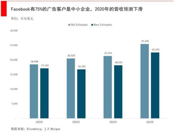 Facebook几乎所有收入来源于广告,其中75%来自中小企业,这令J.P.Morgan下调了27%的2020年增长预期,甚至将2021年也下调了11%。