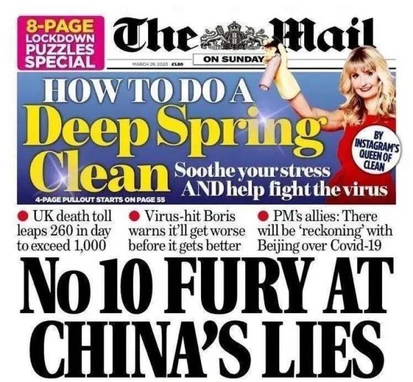 3月29日,英国《每日邮报》的头版文章:《唐宁街10号对中国谎言的愤怒》