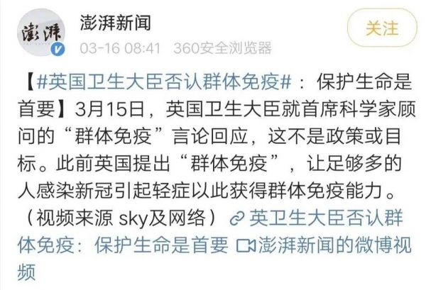 英国卫生大臣也解释过:“群体免疫,它只是一个科学理论概念,是传染病蔓延后出现的副产品,不是英国政府主动寻求的目标。”