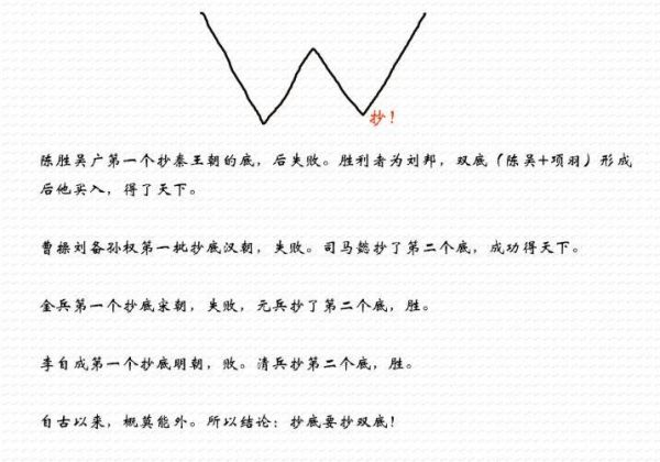又比如,抄底要抄双底。历史上这样的例子不胜枚举,比如曹操刘备孙权第一批抄底汉朝,失败。司马懿抄了第二个底,成功得天下,等等。