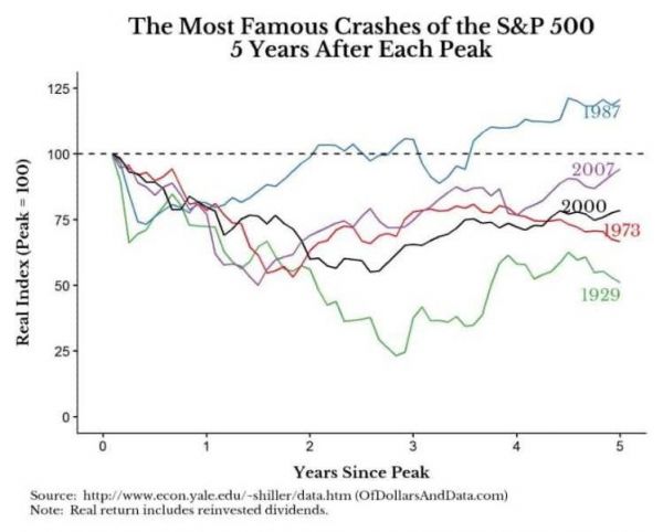 在史上最有名的五次崩盘中,1973年石油危机和2007年金融危机下跌了一年半至两年才探底,1929年大萧条和2000年互联网泡沫都是持续下跌了近三年才找到底部。