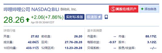 新浪科技讯 4月9日晚间消息,B站开盘涨6.18%,报27.82美元。