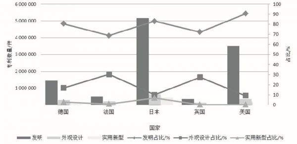 据中国专利数据统计及分析公司patsnap智慧芽对于1978到2017年间美国、英国、日本、法国和德国的专利申请类的统计分析显示,美国申请专利中90.43%的为发明专利,发明专利占比英国为 72.27%、日本为82.92%、法国为 68.81%、德国为80.5%;而我国申请专利中发明专利仅占35.53%(最高时也未能达到40%),且无效专利占所有专利的48.75%(接近一半)。