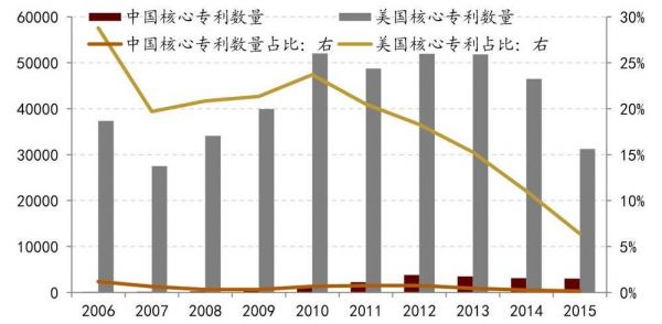 中国核心专利数量比例远远低于美国的核心专利数量占比比例