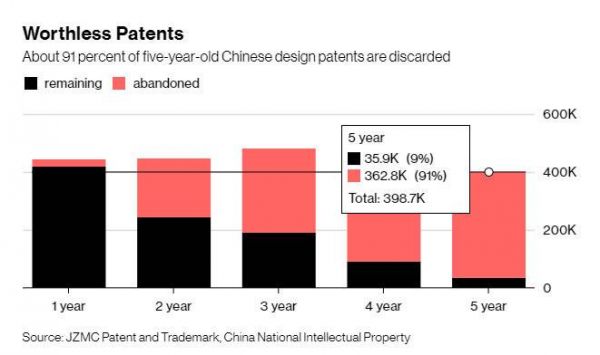 据彭博社根据JZMC专利及商标库以及中国专利部门的数据,统计了2013年至2017年5年间外观设计专利的情况,在总计39.87万件外观专利中,超过91%的外观专利都已经被废弃,原因是专利持有人已经停止支付维护费用。此外,实用新型专利的流失率61%。