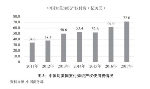 2017年,中国对外支付的知识产权使用费逆差超过200亿美元(约合人民币1265亿元),而美国每年对外许可知识产权净收入接近800亿美元(约合人民币5059亿元);