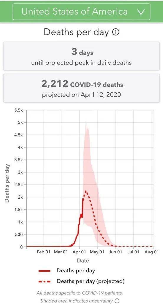 华盛顿大学的模型预估,4月12日复活节全美达到拐点,死亡人数将达到2212人。