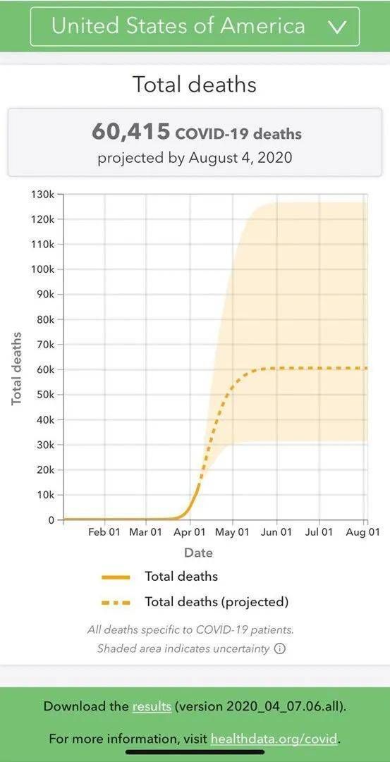 华盛顿大学的数学模型显示,全美拐点将在8月4号到达,死亡总人数将下调至60415人。