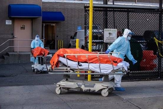 纽约布鲁克林威科夫高地医疗中心的医务人员正在将尸体运往临时停尸房