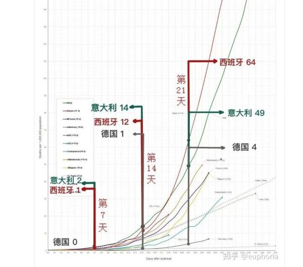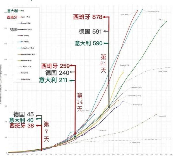 注意,这张图的横坐标原点是各个国家疫情开始爆发的日子(这个日期各不相同),并不是统一的某年某月某日。这样有利于在疫情病程发展的同一阶段横向比较。