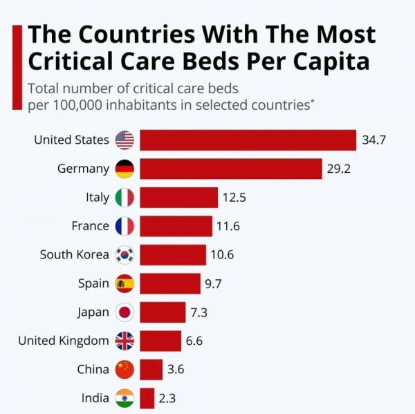 但是在一些基础建设上,比如医疗系统,医院体系,德国这个老牌工业强国底子还是不错的。根据国际经合发展组织(OECD)的数据,德国的人均医院和病床比例是世界上最高的国家之一。