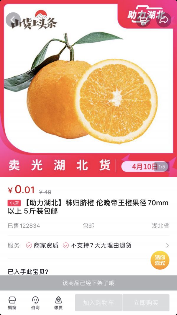 据悉,该秭归春橙以1分钱5斤的包邮价格出售,每人限购一份,当场秒没,截止记者发稿,共售出12万份。而当时直播人数也瞬间多了近20万人。