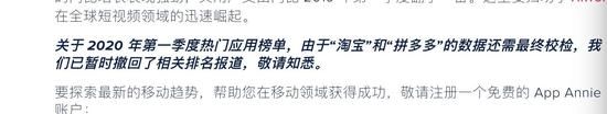 新浪科技讯 4月10日晚间消息,AppAnnie 对昨日删除的报告作出说明称:“关于 2020 年第一季度热门应用榜单,由于“淘宝”和“拼多多”的数据还需最终校检,我们已暂时撤回了相关排名报道,敬请知悉。”